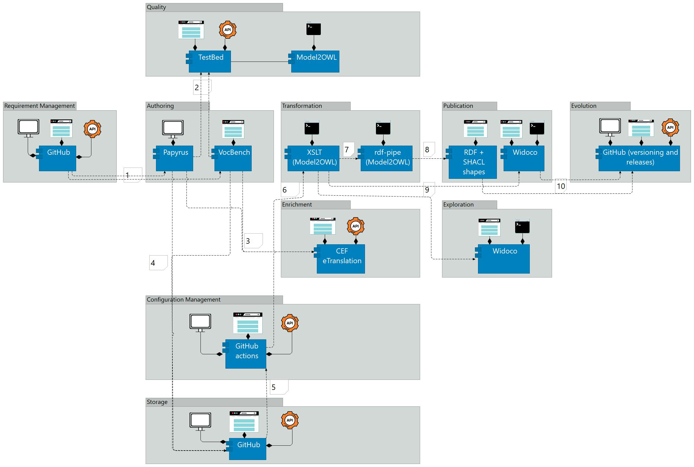 "A simplified architecture of the tooling used by SEMIC to create and edit its specification can be found below. Additionally, tooling recommendations for each architectural component are provided using the dropdown features at the bottom of the page."